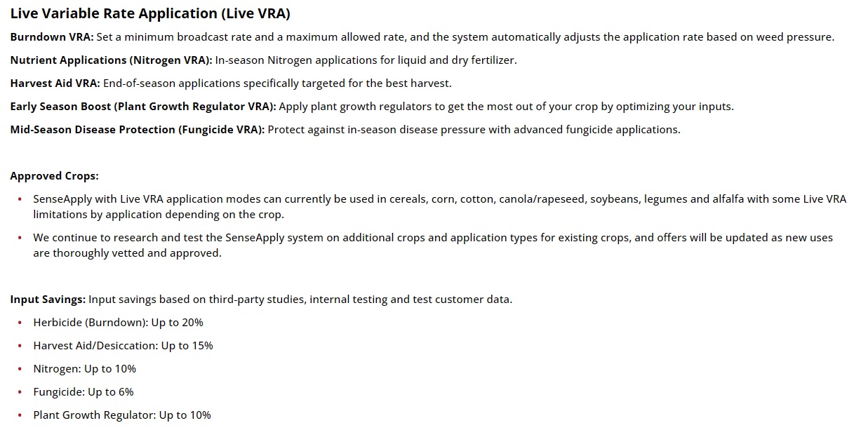 • In Live VRA modes, the SenseApply camera dynamically creates a variable rate prescription in real-time as the applicator drives through the field at speeds up to 25 MPH.